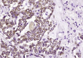 多聚甲醛固定,石蜡包埋(人宫颈癌);用柠檬酸钠缓冲液煮沸(15分钟)提取抗原;用3%过氧化氢阻断内源性过氧化物20分钟;阻断缓冲液(正常山羊血清)37℃30分钟;抗体孵育(BRCA1)多克隆抗体,未结合,1:400,4°C下过夜,然后根据SP试剂盒(兔子)说明和DAB染色进行操作。
