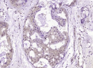 多聚甲醛固定,石蜡包埋(人乳腺癌);经柠檬酸钠缓冲液(pH6.0)煮沸15min后获得抗原;用3%过氧化氢阻断内源性过氧化物酶20分钟;阻断缓冲液(正常山羊血清)37℃30min;用α-肌动蛋白4负荷控制抗体多克隆抗体Unco孵育在4°C温度下,1:400整晚注射,然后根据SP试剂盒(兔子)说明和DAB染色进行操作。