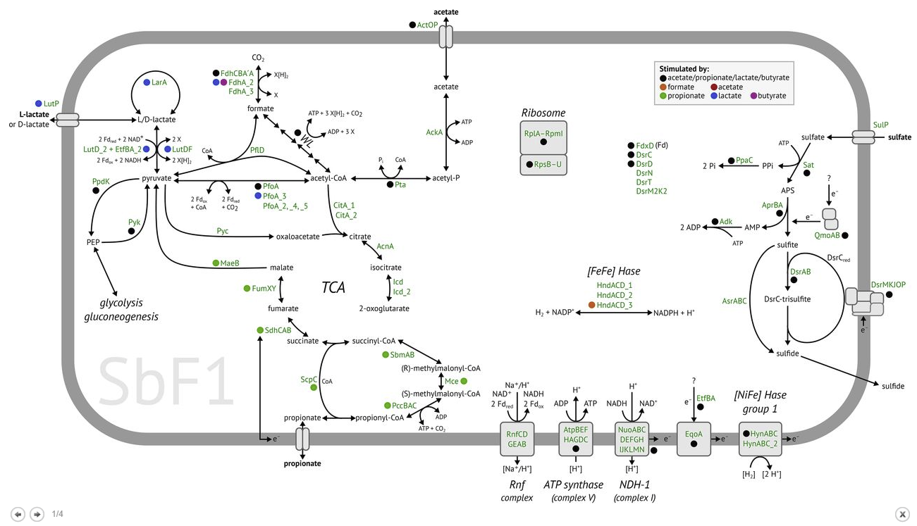 低丰度Desulfosporosinus的多功能能量代谢。Desulfosporosinus SP。MAG SbF1编码了用于异化硫酸盐还原的完整规范途径(图1和表 S1a )。这包括硫酸腺苷酰转移酶(Sat),腺苷酰基硫酸盐还原酶(AprBA),异化亚硫酸还原酶(DsrAB)和释放硫化物的DsrC,它们依次参与硫酸盐还原成硫化物。此外,检测到编码电子传递QmoAB和DsrMKJOP络合物的基因,与他们的亚基组成是典型的用于Desulfosporosinus物种(30,31,33,34)。其他dsr基因包括dsrD,dsrN和dsrT(38),具有迄今未失效的功能; fdxD,编码[4Fe4S] - 赋予毒素; 和第二组DsrMK家族编码基因(dsrM2和dsrK2)。SbF1还编码三聚异化亚硫酸还原酶AsrABC(厌氧亚硫酸还原酶)(39)。