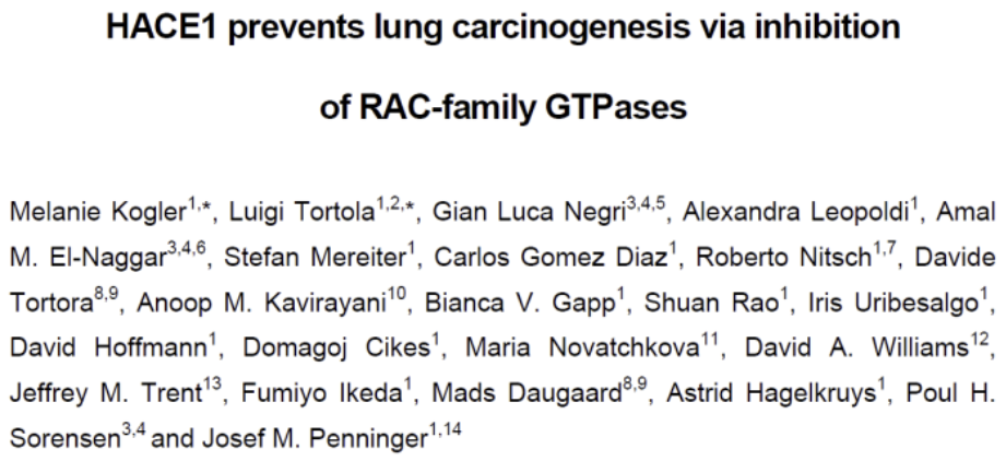 研究结果表明,抑癌基因HACE1的突变破坏了其作为人和鼠类肺癌RAC家族GTPases致癌活性调节剂的作用。