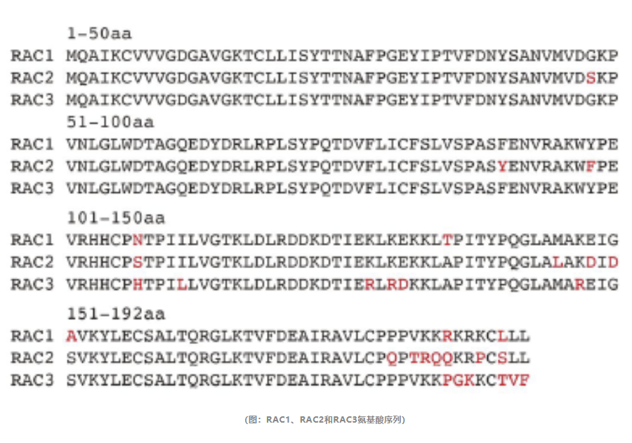 RAC1是一种小GTP酶,可调节细胞增殖,运动,应激反应或活性氧(ROS)的产生。RAC1属于小GTP结合蛋白的RAS超家族,其中还包括RAC2和RAC3。这三种蛋白质的氨基酸序列90%相同,但是具有不同的组织特异性表达谱。RAC1被广泛表达,RAC2的表达主要局限于造血细胞,RAC3广泛表达在大脑中。